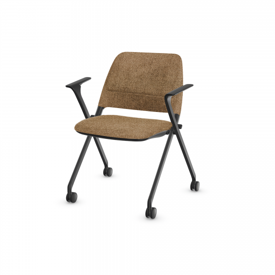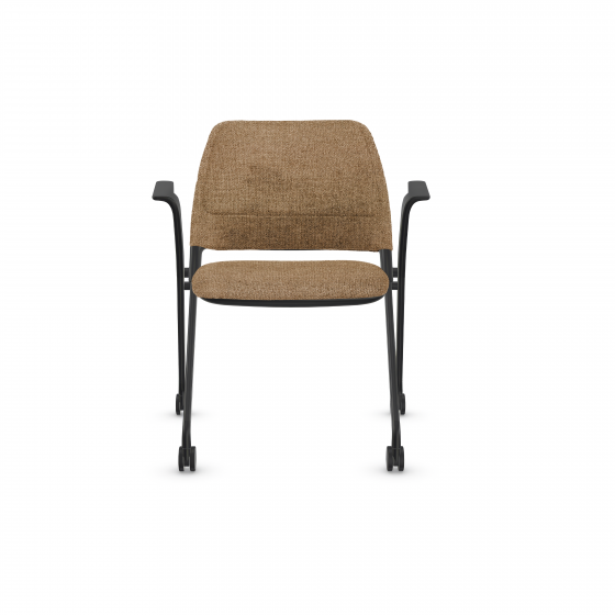 Low-back guest chair on casters with armrests and upholstered seat and backrest.